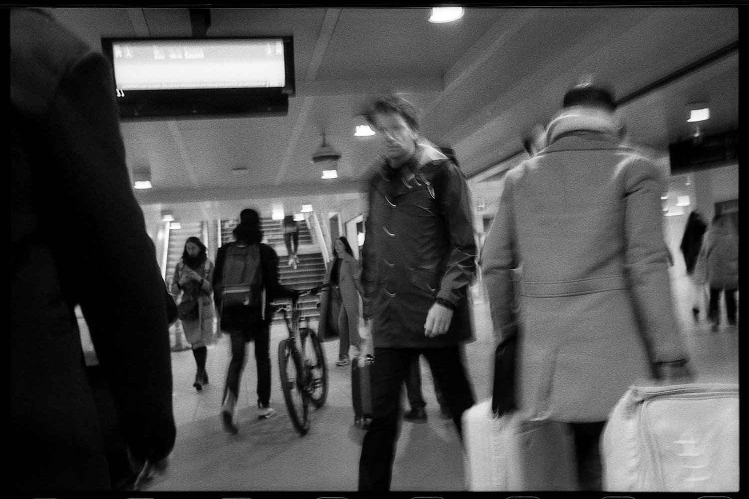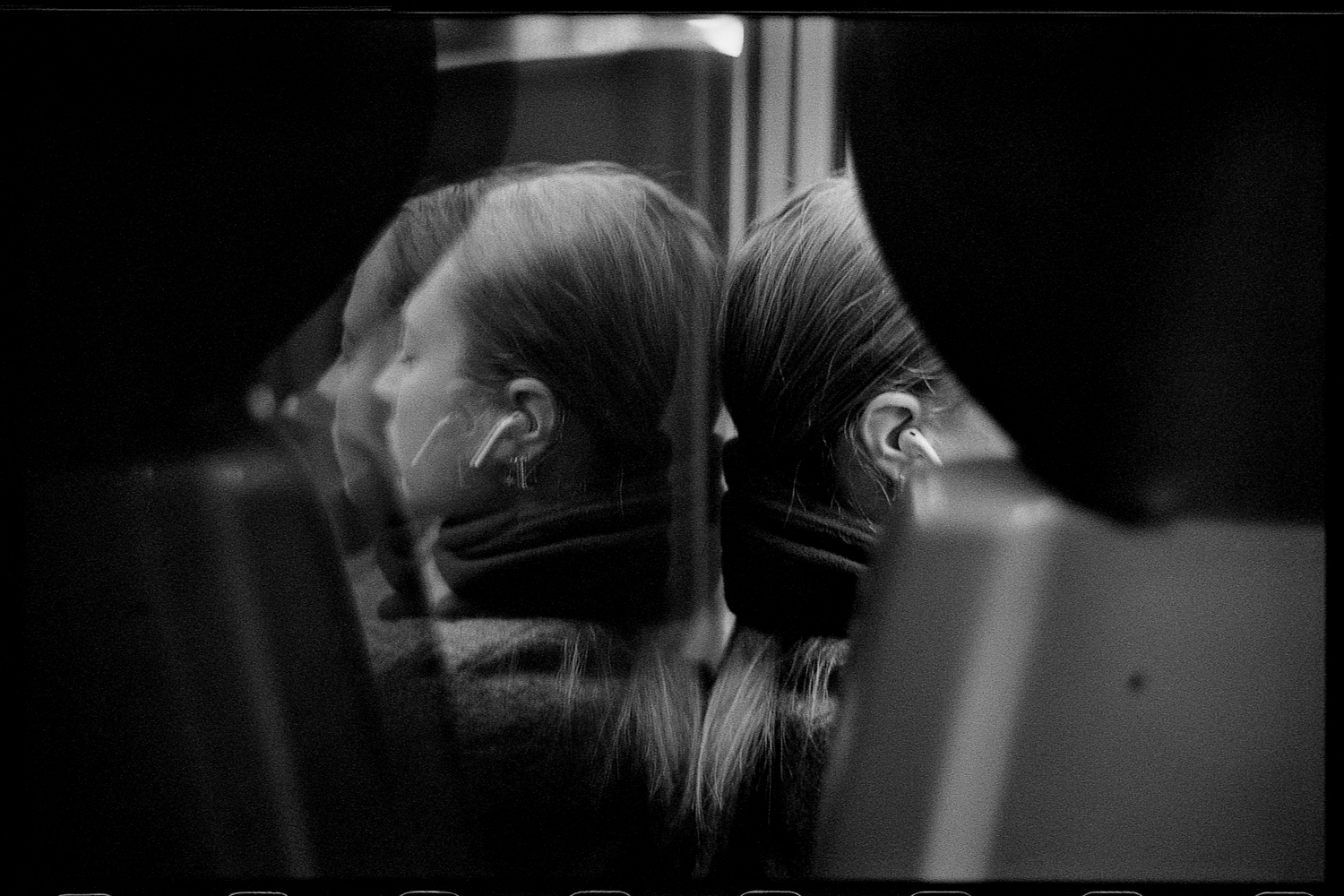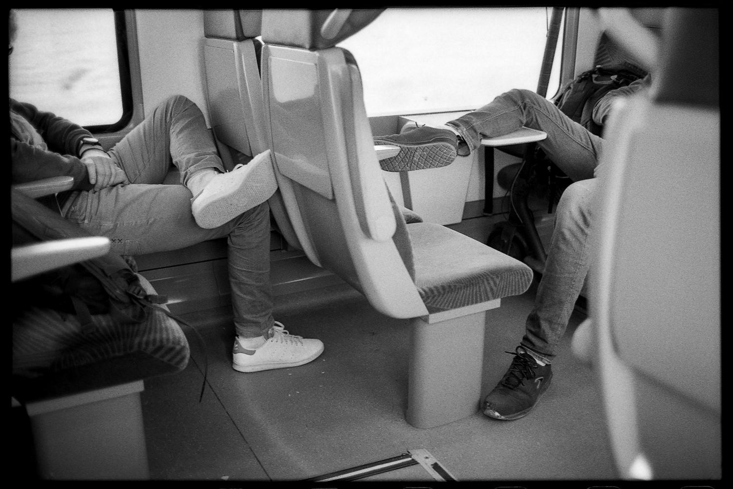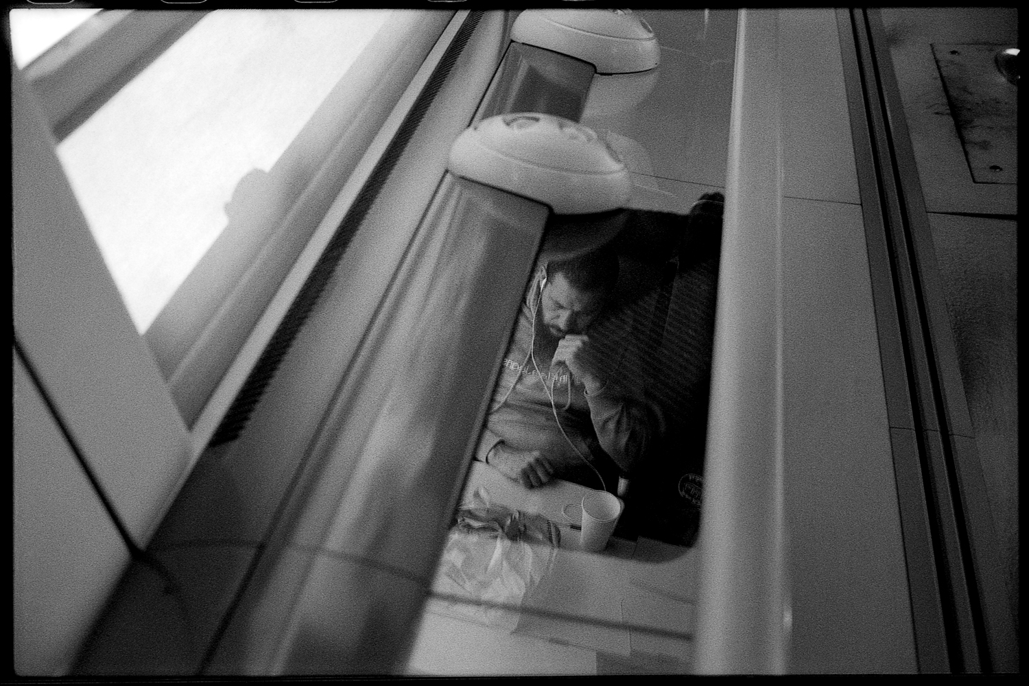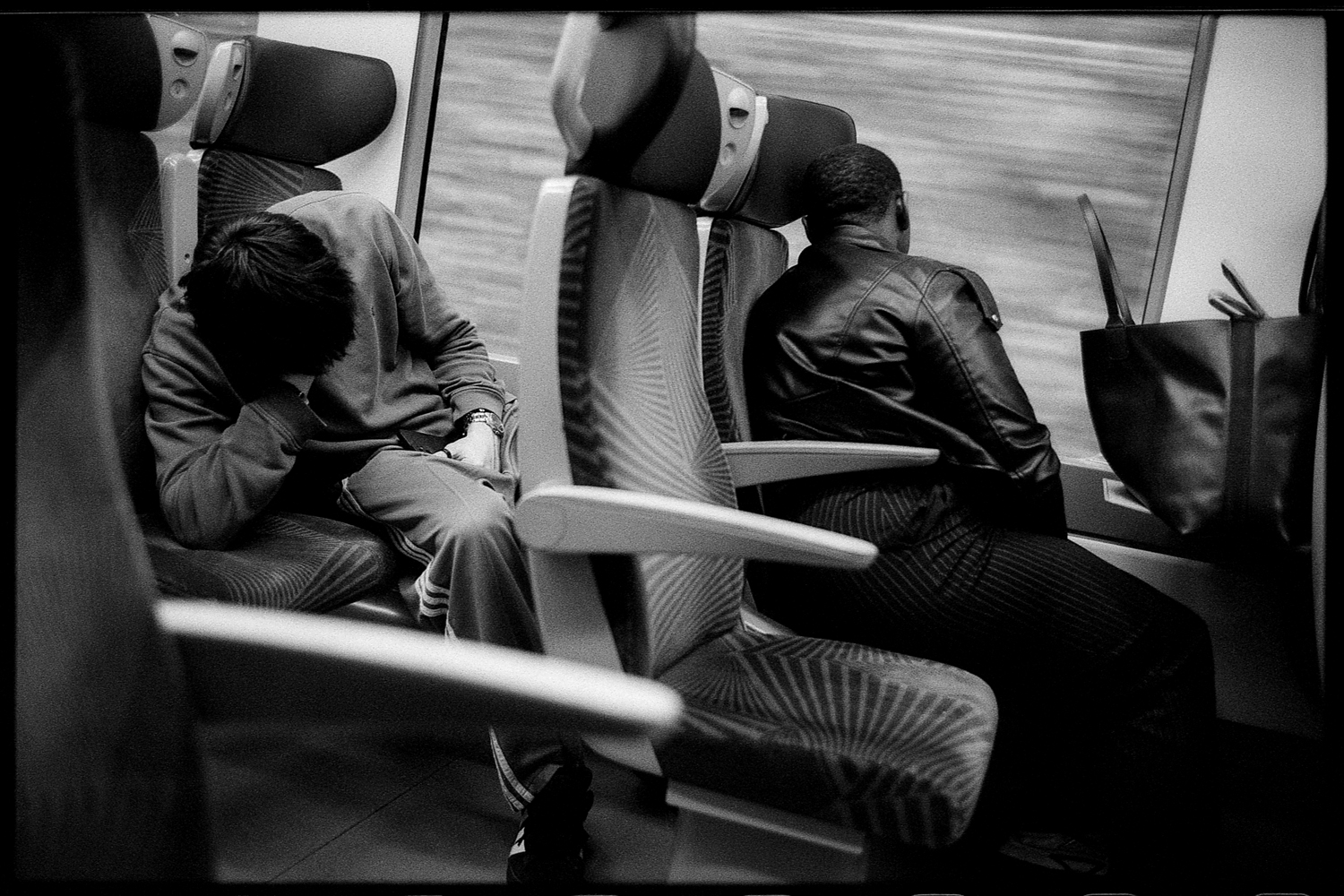 Tentative impressionniste et monochrome de traduire l’atmosphère quotidienne des pendulaires, photos volées, hymne à la routine, à la monotonie, à l’entre-deux de ces moments suspendus.